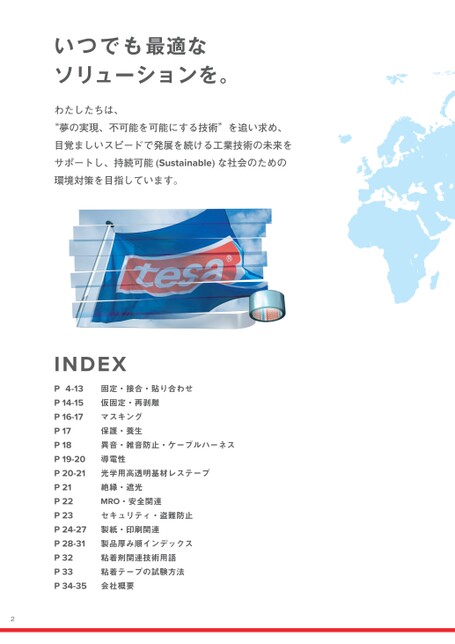 2INDEXP4-13固定・接合・貼り合わせP14-15仮固定・再剥離P16-17マスキングP17保護・養生P18異音・雑音防止・ケーブルハーネスP19-20導電性P20-21光学用高透明基材レステープP21絶縁・遮光P22MRO・安全関連P23セキュリティ・盗難防止P24-27製紙・印刷関連P28-31製品厚み順インデックスP32粘着剤関連技術用語P33粘着テープの試験方法P34-35会社概要いつでも最適なソリューションを。わたしたちは、“夢の実現、不可能を可能にする技術”を追い求め、目覚ましいスピードで発展を続ける工業技術の未来をサポートし、持続可能(Sustainable)な社会のための環境対策を目指しています。2022.12.28(15:28:23)CMYK再校
