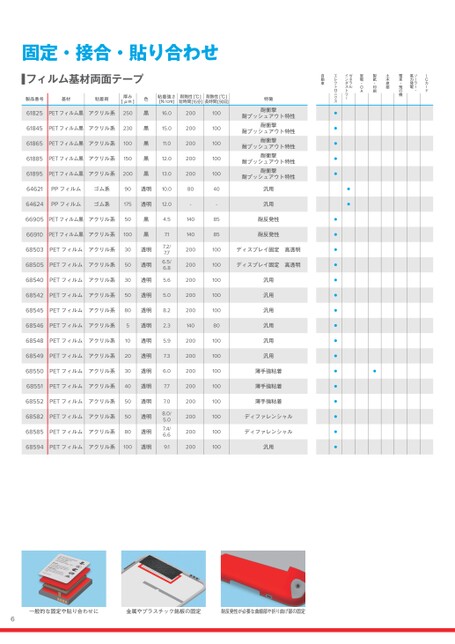 6製品番号基材粘着剤厚み[μm]色粘着強さ[N/cm]耐熱性[℃]短時間[15分]耐熱性[℃]長時間[90日]特徴自動車エレクトロニクスゼネラルインダストリー家電・OA製紙・印刷土木建築電車・飛行機ソーラー・風力発電ICカード61825PETフィルム黒アクリル系250黒16.0200100耐衝撃耐プッシュアウト特性●61845PETフィルム黒アクリル系230黒15.0200100耐衝撃耐プッシュアウト特性●61865PETフィルム黒アクリル系100黒11.0200100耐衝撃耐プッシュアウト特性●61885PETフィルム黒アクリル系150黒12.0200100耐衝撃耐プッシュアウト特性●61895PETフィルム黒アクリル系200黒13.0200100耐衝撃耐プッシュアウト特性●64621PPフィルムゴム系90透明10.08040汎用●64624PPフィルムゴム系175透明12.0--汎用●66905PETフィルム黒アクリル系50黒4.514085耐反発性●66910PETフィルム黒アクリル系100黒7.114085耐反発性●68503PETフィルムアクリル系30透明7.2/7.7200100ディスプレイ固定高透明●68505PETフィルムアクリル系50透明6.5/6.8200100ディスプレイ固定高透明●68540PETフィルムアクリル系30透明5.6200100汎用●68542PETフィルムアクリル系50透明5.0200100汎用●68545PETフィルムアクリル系80透明8.2200100汎用●68546PETフィルムアクリル系5透明2.314080汎用●68548PETフィルムアクリル系10透明5.9200100汎用●68549PETフィルムアクリル系20透明7.3200100汎用●68550PETフィルムアクリル系30透明6.0200100薄手強粘着●●68551PETフィルムアクリル系40透明7.7200100薄手強粘着●68552PETフィルムアクリル系50透明7.0200100薄手強粘着●68582PETフィルムアクリル系50透明8.0/5.0200100ディファレンシャル●68585PETフィルムアクリル系80透明7.4/6.6200100ディファレンシャル●68594PETフィルムアクリル系100透明9.1200100汎用●固定・接合・貼り合わせフィルム基材両面テープ製品番号基材粘着剤厚み[μm]色粘着強さ[N/cm]耐熱性[℃]短時間[15分]耐熱性[℃]長時間[90日]特徴自動車エレクトロニクスゼネラルインダストリー家電・OA製紙・印刷土木建築電車・飛行機ソーラー・風力発電ICカード68595PETフィルムアクリル系125透明9.4200100汎用●68596PETフィルムアクリル系150透明10.0200100汎用●68597PETフィルムアクリル系200透明10.5200100汎用●68598PETフィルムアクリル系250透明10.8200100汎用●68599PETフィルムアクリル系300透明12.0200100汎用●68732PETフィルムアクリル系50黒5.514085難接着+浮き防止●68740PETフィルム黒アクリル系30黒4.5200100汎用●●68742PETフィルム黒アクリル系50黒5.0200100汎用●68745PETフィルム黒アクリル系80黒8.2200100汎用●68747PETフィルム黒アクリル系100黒8.715080汎用●68873PETフィルムアクリル系30透明8.4--ポストコンシューマーリサイクル材料(PCR)PET基材にバイオマス由来のアクリル系粘着剤を塗工した両面テープ●68875PETフィルムアクリル系50透明10.8--ポストコンシューマーリサイクル材料(PCR)PET基材にバイオマス由来のアクリル系粘着剤を塗工した両面テープ●68877PETフィルムアクリル系100透明12.6--ポストコンシューマーリサイクル材料(PCR)PET基材にバイオマス由来のアクリル系粘着剤を塗工した両面テープ●68905PETフィルムアクリル系50透明5.514085耐反発●68910PETフィルムアクリル系100透明7.914085耐反発●68960PETフィルムアクリル系30透明9.5--再剥離性●68962PETフィルムアクリル系50透明12.1--再剥離性●68964PETフィルムアクリル系100透明17.0--再剥離性●一般的な固定や貼り合わせに金属やプラスチック銘板の固定耐反発性が必要な曲線部や折り曲げ部の固定2022.12.28(15:29:20)CMYK念校