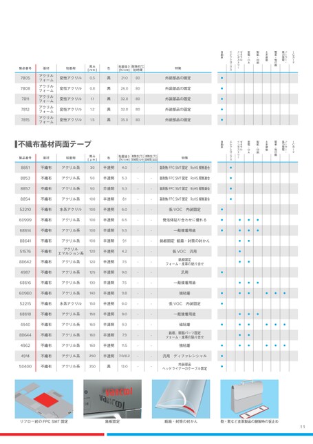 11製品番号基材粘着剤厚み[μm]色粘着強さ[N/cm]特徴自動車エレクトロニクスゼネラルインダストリー家電・OA製紙・印刷土木建築電車・飛行機ソーラー・風力発電ICカード75635アクリルフォームアクリル系350黒19.9耐衝撃防水遮光●75640アクリルフォームアクリル系400黒22.0耐衝撃防水遮光●75710アクリルフォームアクリル系100黒11.2高プッシュアウト耐衝撃防水PET補強材入り●75715アクリルフォームアクリル系150黒13.5高プッシュアウト耐衝撃防水PET補強材入り●75720アクリルフォームアクリル系200黒13.5高プッシュアウト耐衝撃防水PET補強材入り●75725アクリルフォームアクリル系250黒13.6高プッシュアウト耐衝撃防水PET補強材入り●75730アクリルフォームアクリル系300黒14.2高プッシュアウト耐衝撃防水PET補強材入り●75735アクリルフォームアクリル系350黒14.6高プッシュアウト耐衝撃防水PET補強材入り●75745アクリルフォームアクリル系250白13.6高プッシュアウト耐衝撃防水PET補強材入り●製品番号基材粘着剤厚み[mm]色粘着強さ[N/cm]耐熱性℃短時間特徴自動車エレクトロニクスゼネラルインダストリー家電・OA製紙・印刷土木建築電車・飛行機ソーラー・風力発電ICカード77108アクリルフォームアクリル系0.8黒29.090外装部品の固定●77112アクリルフォームアクリル系1.2黒30.090外装部品の固定●77115アクリルフォームアクリル系1.5黒34.090外装部品の固定●77204アクリルフォームアクリル系0.4グレー22.080外装部品の固定●77208アクリルフォームアクリル系0.8グレー24.080外装部品の固定●77212アクリルフォームアクリル系1.2グレー27.080外装部品の固定●77608アクリルフォームLSE0.8グレー25.0/31.080外装部品の固定カバーサイドプライマーレス●77611アクリルフォームLSE1.1グレー26.0/31.080外装部品の固定カバーサイドプライマーレス●77615アクリルフォームLSE1.5グレー26.0/37.080外装部品の固定カバーサイドプライマーレス●77708アクリルフォームLSE0.8グレー31.0/25.080外装部品の固定オープンサイドプライマーレス●77711アクリルフォームLSE1.1グレー31.0/26.080外装部品の固定オープンサイドプライマーレス●77715アクリルフォームLSE1.5グレー37.0/26.080外装部品の固定オープンサイドプライマーレス●77805アクリルフォームLSE0.5グレー28.080外装部品の固定両面プライマーレス●77808アクリルフォームLSE0.8グレー31.080外装部品の固定両面プライマーレス●77811アクリルフォームLSE1.1グレー35.080外装部品の固定両面プライマーレス●77815アクリルフォームLSE1.5グレー39.080外装部品の固定両面プライマーレス●製品番号基材粘着剤厚み[mm]色粘着強さ[N/cm]耐熱性℃短時間特徴自動車エレクトロニクスゼネラルインダストリー家電・OA製紙・印刷土木建築電車・飛行機ソーラー・風力発電ICカード7805アクリルフォーム変性アクリル0.5黒21.080外装部品の固定●7808アクリルフォーム変性アクリル0.8黒26.080外装部品の固定●7811アクリルフォーム変性アクリル1.1黒32.080外装部品の固定●7812アクリルフォーム変性アクリル1.2黒32.080外装部品の固定●7815アクリルフォーム変性アクリル1.5黒35.080外装部品の固定●製品番号基材粘着剤厚み[μm]色粘着強さ[N/cm]耐熱性[℃]短時間[15分]耐熱性[℃]長時間[90日]特徴自動車エレクトロニクスゼネラルインダストリー家電・OA製紙・印刷土木建築電車・飛行機ソーラー・風力発電ICカード8851不織布アクリル系30半透明4.0--高耐熱FPCSMT固定RoHS規制適合●8853不織布アクリル系50半透明5.3--高耐熱FPCSMT固定RoHS規制適合●8857不織布アクリル系50半透明5.3--高耐熱FPCSMT固定RoHS規制適合●8854不織布アクリル系100半透明8.1--高耐熱FPCSMT固定RoHS規制適合●52210不織布水系アクリル100半透明6.0--低VOC内装固定●60999不織布アクリル系100半透明6.5--発泡体貼り合わせに優れる●●●●68614不織布アクリル系100半透明5.5--一般接着用途●●●●88641不織布アクリル系100半透明9.1--銘板固定紙箱・封筒の封かん●●51576不織布アクリルエマルジョン系120半透明4.2--低VOC汎用●88642不織布アクリル系120半透明7.5--銘板固定フォーム・皮革の貼り合せ●●4987不織布アクリル系125半透明9.0--汎用●68616不織布アクリル系130半透明7.5--一般接着用途●●●60980不織布アクリル系140半透明9.8--強粘着●●●●●●52215不織布水系アクリル150半透明6.0--低VOC内装固定●68618不織布アクリル系150半透明9.0--一般接着用途●●●4940不織布アクリル系160半透明9.3--強粘着●●●●●●88644不織布アクリル系160半透明7.9--銘板、樹脂パーツ固定フォーム・皮革の貼り合せ●●4962不織布アクリル系160半透明11.5--強粘着●●●●●●4914不織布アクリル系250半透明7.0/8.2--汎用ディファレンシャル●50400不織布アクリル系350黒13.0--内装部品ヘッドライナーのケーブル固定●不織布基材両面テープリフロー前のFPCSMT固定鞄・靴など皮革製品の縫製時の仮止め紙箱・封筒の封かん銘板固定2022.12.28(15:30:15)再校CMYK