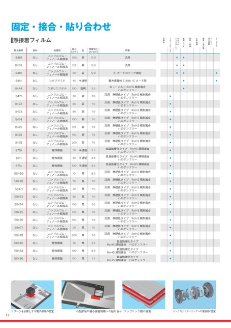 12固定・接合・貼り合わせリワークを必要とする電子部品の固定シンクロナイザーリングへの摩擦材の固定熱接着フィルムその他製品製品番号基材粘着剤厚み[μm]色粘着強さ[N/cm]特徴自動車エレクトロニクスゼネラルインダストリー家電・OA製紙・印刷土木建築電車・飛行機ソーラー・風力発電ICカード4646PEアクリル系180透明4.4耐水性・耐熱性良好ビニールフィルム、POフィルムの補修●4651アクリルコート綿布ゴム系310黒白青黄赤緑灰3.3補修マーキング部品固定片面布テープ●4657PV1アクリルコート綿布ゴム系290グレー4.0補修部品固定片面布テープ●4688PEコート布ゴム系260黒白青黄赤緑灰4.5汎用片面布テープ手切れ性AREVATLV9027/01/06原子力発電所での使用認定製品●4900なしアクリル系50透明3.4基材レス両面テープタック耐熱性耐久性に優れる紙・フィルムのスプライスやポスターなどの固定●4968PVCアクリル系295白12.5汎用両面テープ●4974布ゴム系380白5.0汎用両面テープ●4985なしアクリル系50透明8.0基材レス両面テープ初期タックに優れ特に粗面によくつきます●●5938PET布合成ゴム190黒8.0/14.0初期粘着に優れズレや浮き上がりを防止カーペットやファブリックの仮固定ディファレンシャルタイプ●5939PET布合成ゴム190白8.0/14.0初期粘着に優れズレや浮き上がりを防止カーペットやファブリックの仮固定ディファレンシャルタイプ●50103PETアクリル系90透明6.0PET片面テープケーブル固定●50118PET不織布アクリル系570黒・白10.1ケーブル固定用フリース片面テープ●50204PEアクリル系180半透明青8.7ケーブル固定用PE片面テープ手切れ性●51570不織布ゴム系110半透明12.0汎用両面テープ●51575不織布アクリルエマルジョン系90半透明3.2汎用両面テープ●52664布ゴム系390白7.5汎用両面テープ●●54338PETアクリル系95透明4.0ホールカバー用PET片面テープの打ち抜き品●54657アクリルコート綿布ゴム系290グレー4.0ホールカバー用布片面テープ打ち抜き品●60400PLA(ポリ乳酸)天然ゴム55透明3.5バイオマス由来梱包用テープ(本製品に含まれる炭素の98%がバイオマス由来)中型サイズ(15~30kg)段ボールの封かんに適する●66022なし水系アクリル220透明12.3ターポリン、ビニールの補修難接着樹脂の接合●92105なし高機能発泡エラストマー500黒31.0プライマーレス低極性樹脂接着●92108なし高機能発泡エラストマー800黒35.0プライマーレス低極性樹脂接着●92111なし高機能発泡エラストマー1100黒39.0プライマーレス低極性樹脂接着●製品番号基材粘着剤厚み[μm]色接着強さ[N/mm2]特徴自動車エレクトロニクスゼネラルインダストリー家電・OA製紙・印刷土木建築電車・飛行機ソーラー・風力発電ICカード8401なしニトリルゴム・フェノール樹脂系200茶12.0汎用●●8402なしニトリルゴム・フェノール樹脂系125茶12.0汎用●●8410なしニトリルゴム・フェノール樹脂系60茶12.0ICカードのチップ固定●●●8414なしコポリアミド45半透明-異方導電性Z方向ICカード用●●8444なしコポリエステル100透明5.5ホットメルトRoHS規制適合ハロゲンフリー●8471なしニトリルゴム・フェノール樹脂系30茶7.0汎用熱硬化タイプRoHS規制適合ハロゲンフリー●8472なしニトリルゴム・フェノール樹脂系60茶7.0汎用熱硬化タイプRoHS規制適合ハロゲンフリー●8473なしニトリルゴム・フェノール樹脂系80茶7.0汎用熱硬化タイプRoHS規制適合ハロゲンフリー●8474なしニトリルゴム・フェノール樹脂系100茶7.0汎用熱硬化タイプRoHS規制適合ハロゲンフリー●8475なしニトリルゴム・フェノール樹脂系125茶7.0汎用熱硬化タイプRoHS規制適合ハロゲンフリー●8476なしニトリルゴム・フェノール樹脂系150茶7.0汎用熱硬化タイプRoHS規制適合ハロゲンフリー●8478なしニトリルゴム・フェノール樹脂系200茶7.0汎用熱硬化タイプRoHS規制適合ハロゲンフリー●8710なし特殊樹脂50半透明5.5低温熱硬化タイプRoHS規制適合ハロゲンフリー●8711なし特殊樹脂30半透明5.5低温熱硬化タイプRoHS規制適合ハロゲンフリー●8714なし特殊樹脂100半透明6.5低温熱硬化タイプRoHS規制適合ハロゲンフリー●58469なしニトリルゴム・フェノール樹脂系10黒6.0汎用熱硬化タイプRoHS規制適合ハロゲンフリー●58470なしニトリルゴム・フェノール樹脂系50黒7.0汎用熱硬化タイプRoHS規制適合ハロゲンフリー●58471なしニトリルゴム・フェノール樹脂系30黒7.0汎用熱硬化タイプRoHS規制適合ハロゲンフリー●58473なしニトリルゴム・フェノール樹脂系80黒7.0汎用熱硬化タイプRoHS規制適合ハロゲンフリー●58474なしニトリルゴム・フェノール樹脂系100黒7.0汎用熱硬化タイプRoHS規制適合ハロゲンフリー●58475なしニトリルゴム・フェノール樹脂系125黒7.0汎用熱硬化タイプRoHS規制適合ハロゲンフリー●58476なしニトリルゴム・フェノール樹脂系150黒7.0汎用熱硬化タイプRoHS規制適合ハロゲンフリー●58477なしニトリルゴム・フェノール樹脂系20黒7.0汎用熱硬化タイプRoHS規制適合ハロゲンフリー●58478なしニトリルゴム・フェノール樹脂系200黒7.0汎用熱硬化タイプRoHS規制適合ハロゲンフリー●58480なし特殊樹脂50黒5.5低温熱硬化タイ