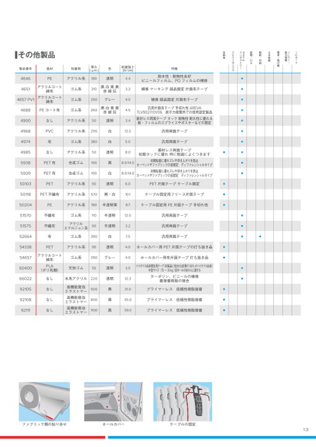 13その他製品製品番号基材粘着剤厚み[μm]色粘着強さ[N/cm]特徴自動車エレクトロニクスゼネラルインダストリー家電・OA製紙・印刷土木建築電車・飛行機ソーラー・風力発電ICカード4646PEアクリル系180透明4.4耐水性・耐熱性良好ビニールフィルム、POフィルムの補修●4651アクリルコート綿布ゴム系310黒白青黄赤緑灰3.3補修マーキング部品固定片面布テープ●4657PV1アクリルコート綿布ゴム系290グレー4.0補修部品固定片面布テープ●4688PEコート布ゴム系260黒白青黄赤緑灰4.5汎用片面布テープ手切れ性AREVATLV9027/01/06原子力発電所での使用認定製品●4900なしアクリル系50透明3.4基材レス両面テープタック耐熱性耐久性に優れる紙・フィルムのスプライスやポスターなどの固定●4968PVCアクリル系295白12.5汎用両面テープ●4974布ゴム系380白5.0汎用両面テープ●4985なしアクリル系50透明8.0基材レス両面テープ初期タックに優れ特に粗面によくつきます●●5938PET布合成ゴム190黒8.0/14.0初期粘着に優れズレや浮き上がりを防止カーペットやファブリックの仮固定ディファレンシャルタイプ●5939PET布合成ゴム190白8.0/14.0初期粘着に優れズレや浮き上がりを防止カーペットやファブリックの仮固定ディファレンシャルタイプ●50103PETアクリル系90透明6.0PET片面テープケーブル固定●50118PET不織布アクリル系570黒・白10.1ケーブル固定用フリース片面テープ●50204PEアクリル系180半透明青8.7ケーブル固定用PE片面テープ手切れ性●51570不織布ゴム系110半透明12.0汎用両面テープ●51575不織布アクリルエマルジョン系90半透明3.2汎用両面テープ●52664布ゴム系390白7.5汎用両面テープ●●54338PETアクリル系95透明4.0ホールカバー用PET片面テープの打ち抜き品●54657アクリルコート綿布ゴム系290グレー4.0ホールカバー用布片面テープ打ち抜き品●60400PLA(ポリ乳酸)天然ゴム55透明3.5バイオマス由来梱包用テープ(本製品に含まれる炭素の98%がバイオマス由来)中型サイズ(15~30kg)段ボールの封かんに適する●66022なし水系アクリル220透明12.3ターポリン、ビニールの補修難接着樹脂の接合●92105なし高機能発泡エラストマー500黒31.0プライマーレス低極性樹脂接着●92108なし高機能発泡エラストマー800黒35.0プライマーレス低極性樹脂接着●92111なし高機能発泡エラストマー1100黒39.0プライマーレス低極性樹脂接着●製品番号基材粘着剤厚み[μm]色接着強さ[N/mm2特徴自動車エレクトロニクスゼネラルインダストリー家電・OA製紙・印刷土木建築電車・飛行機ソーラー・風力発電ICカード8401なしニトリルゴム・フェノール樹脂系200茶12.0汎用●●8402なしニトリルゴム・フェノール樹脂系125茶12.0汎用●●8410なしニトリルゴム・フェノール樹脂系60茶12.0ICカードのチップ固定●●●8414なしコポリアミド45半透明-異方導電性Z方向ICカード用●●8444なしコポリエステル100透明5.5ホットメルトRoHS規制適合ハロゲンフリー●8471なしニトリルゴム・フェノール樹脂系30茶7.0汎用熱硬化タイプRoHS規制適合ハロゲンフリー●8472なしニトリルゴム・フェノール樹脂系60茶7.0汎用熱硬化タイプRoHS規制適合ハロゲンフリー●8473なしニトリルゴム・フェノール樹脂系80茶7.0汎用熱硬化タイプRoHS規制適合ハロゲンフリー●8474なしニトリルゴム・フェノール樹脂系100茶7.0汎用熱硬化タイプRoHS規制適合ハロゲンフリー●8475なしニトリルゴム・フェノール樹脂系125茶7.0汎用熱硬化タイプRoHS規制適合ハロゲンフリー●8476なしニトリルゴム・フェノール樹脂系150茶7.0汎用熱硬化タイプRoHS規制適合ハロゲンフリー●8478なしニトリルゴム・フェノール樹脂系200茶7.0汎用熱硬化タイプRoHS規制適合ハロゲンフリー●8710なし特殊樹脂50半透明5.5低温熱硬化タイプRoHS規制適合ハロゲンフリー●8711なし特殊樹脂30半透明5.5低温熱硬化タイプRoHS規制適合ハロゲンフリー●8714なし特殊樹脂100半透明6.5低温熱硬化タイプRoHS規制適合ハロゲンフリー●58469なしニトリルゴム・フェノール樹脂系10黒6.0汎用熱硬化タイプRoHS規制適合ハロゲンフリー●58470なしニトリルゴム・フェノール樹脂系50黒7.0汎用熱硬化タイプRoHS規制適合ハロゲンフリー●58471なしニトリルゴム・フェノール樹脂系30黒7.0汎用熱硬化タイプRoHS規制適合ハロゲンフリー●58473なしニトリルゴム・フェノール樹脂系80黒7.0汎用熱硬化タイプRoHS規制適合ハロゲンフリー●58474なしニトリルゴム・フェノール樹脂系100黒7.0汎用熱硬化タイプRoHS規制適合ハロゲンフリー●58475なしニトリルゴム・フェノール樹脂系125黒7.0汎用熱硬化タイプRoHS規制適合ハロゲンフリー●58476なしニトリルゴム・フェノール樹脂系150黒7.0汎用熱硬化タイプRoHS規制適合ハロゲンフリー●58477なしニトリルゴム・フェノール樹脂系20黒7.0汎用熱硬化タイプRoHS規制適合ハロゲンフリー●58478なしニトリルゴム・フェノール樹脂系200黒7.0汎用熱硬化タイプRoHS規制適合ハロゲンフリー●58480なし特殊樹脂50黒5.5低温熱硬化タイプRoHS規制適合ハロゲンフリー●58484なし特殊樹脂100黒6.5低温熱硬化タイプRoHS規制適合ハロゲンフリー●58486なし特殊樹脂15