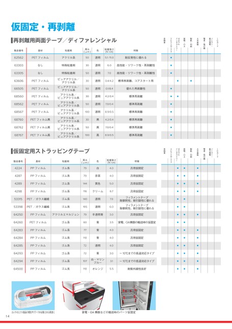 14モバイル機器のバッテリー固定製品番号基材粘着剤厚み[μm]色粘着強さ[N/cm]特徴自動車エレクトロニクスゼネラルインダストリー家電・OA製紙・印刷土木建築電車・飛行機ソーラー・風力発電ICカード64815特殊基材特殊150白12.0耐衝撃性・高保持力●64816特殊基材特殊150白11.0耐衝撃性・高保持力●64825特殊基材特殊250白12.0耐衝撃性・高保持力●67215PUフィルム特殊150白9.5耐衝撃性●70350なし特殊500透明20.0標準タイプ●●70410なし特殊100白9.0標準タイプ●70415なし特殊150白13.0標準タイプ●70420なし特殊200白14.0標準タイプ●70425なし特殊250白14.0標準タイプ●70430なし特殊300白19.0耐衝撃性・高保持力●70440なし特殊400白23.0標準タイプ●70465なし特殊650白27.0標準タイプ●70480なし特殊800白26.0耐衝撃性・高保持力●70525なし特殊250白15.0耐熱性・高保持力●70550なし特殊500白20.0耐熱性・高保持力●70610なし特殊100黒9.0標準タイプ●70615なし特殊150黒11.0標準タイプ●70620なし特殊200黒13.0標準タイプ●70625なし特殊250黒14.0標準タイプ●70640なし特殊400黒17.0標準タイプ●70650なし特殊500黒18.0標準タイプ●70665なし特殊650黒22.0標準タイプ●ボンド&ディタッチ製品番号基材粘着剤厚み[μm]色粘着強さ[N/cm]特徴自動車エレクトロニクスゼネラルインダストリー家電・OA製紙・印刷土木建築電車・飛行機ソーラー・風力発電ICカード4224PPフィルムゴム系79白4.0汎用仮固定●●●4287PPフィルムゴム系79赤茶4.0汎用仮固定●●●4289PPフィルムゴム系144黄色5.0汎用仮固定●●●4298PPフィルムゴム系116クリーム6.7汎用仮固定●●●53315PET/ガラス繊維ゴム系140透明7.0フィラメントテープ耐摩耗性、耐引裂性に優れる●●53398PET/ガラス繊維ゴム系195透明6.0フィラメントテープ耐摩耗性、耐引裂性に優れる●●64250PPフィルムアクリルエマルジョン79半透明青3.0汎用仮固定●●●64260PETフィルムゴム系60青3.5家電、OA機器の輸送時の仮固定●●64283PPフィルムゴム系77青4.0汎用仮固定●●●64284PPフィルムゴム系110青4.0汎用仮固定●●●64285PPフィルムゴム系72透明4.0汎用仮固定●●●64293PPフィルムゴム系72青3.0-10℃までの低温対応タイプ●●●64294PPフィルムゴム系107白・マリンブルー3.1-10℃までの低温対応タイプ●●●64500PPフィルムゴム系110オレンジ5.5耐紫外線性良好●●●仮固定用ストラッピングテープ仮固定・再剥離製品番号基材粘着剤厚み[μm]色粘着強さ[N/cm]特徴自動車エレクトロニクスゼネラルインダストリー家電・OA製紙・印刷土木建築電車・飛行機ソーラー・風力発電ICカード62562PETフィルムアクリル系50透明5.1/11.0耐反発性に優れる●63303なし特殊粘着剤30透明6.0高性能・リワーク性・再剥離性●63305なし特殊粘着剤50透明7.0高性能・リワーク性・再剥離性●63606PETフィルムピュアアクリル/アクリル系30透明0.4/4.2標準再剥離、コアスタート用●●66505PETフィルムピュアアクリル/アクリル系50透明0.1/8.4優れた再剥離性●68560PETフィルムアクリル系/ピュアアクリル系30透明4.2/0.4標準再剥離●●68562PETフィルムアクリル系/ピュアアクリル系50透明7.0/0.4標準再剥離●68567PETフィルムアクリル系/ピュアアクリル系100透明8.9/0.5標準再剥離●68760PETフィルム黒アクリル系/ピュアアクリル系30黒4.2/0.4標準再剥離●68762PETフィルム黒アクリル系/ピュアアクリル系50黒7.0/0.4標準再剥離●68767PETフィルム黒アクリル系/ピュアアクリル系100黒8.9/0.5標準再剥離●再剥離用両面テープ/ディファレンシャル家電・OA機器などの輸送時のパーツ仮固定エレクトロニクス部品の梱包やリワークが必要とされる用途にAchtung:PDFimmeralsPDFX4abspeichern,daessonstzuFehlanzeigenindenTransparenzenkommenkann!2022.12.28(15:30:57)CMYK念校