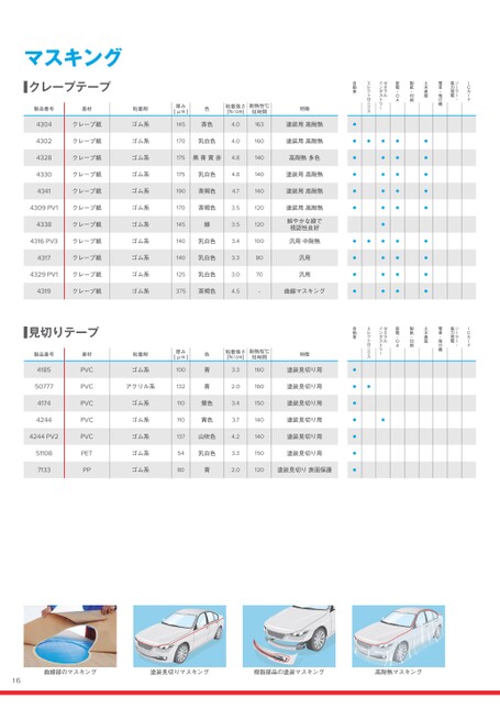 16製品番号基材粘着剤厚み[μm]色粘着強さ[N/cm]耐熱性℃短時間特徴自動車エレクトロニクスゼネラルインダストリー家電・OA製紙・印刷土木建築電車・飛行機ソーラー・風力発電ICカード51407ポリイミドシリコーン系62茶2.5260高耐熱性モーター、トランスの層間絶縁、導体絶縁●●51408JPVKポリイミドシリコーン系65茶3.1260高耐熱性モーター、トランスの層間絶縁、導体絶縁●●50650PETシリコーン系55半透明青3.3220汎用高温マスキング●●●●●50600PETシリコーン系80半透明緑4.0220汎用高温マスキング●●●●●●50680PETシリコーン系80透明4.0220汎用高温マスキング●●●●●61124PETシリコーン系60半透明青3.5220汎用高温マスキング●61128PETシリコーン系85白4.3220汎用高温マスキング●●●●61126PETシリコーン系125赤4.3220汎用高温マスキング●●●●4331PET+不織布シリコーン系110乳白色4.0200高温粉体塗装●●4657アクリルコート綿布ゴム系290グレー4.0180塗装用高耐熱●7140PVCゴム系168黄色4.0170塗装用高耐熱●高耐熱マスキングテープ見切りテープ製品番号基材粘着剤厚み[μm]色粘着強さ[N/cm]耐熱性℃短時間特徴自動車エレクトロニクスゼネラルインダストリー家電・OA製紙・印刷土木建築電車・飛行機ソーラー・風力発電ICカード4185PVCゴム系100青3.3160塗装見切り用●50777PVCアクリル系132青2.0160塗装見切り用●●4174PVCゴム系110鶯色3.4150塗装見切り用●4244PVCゴム系110黄色3.7140塗装見切り用●●4244PV2PVCゴム系137山吹色4.2140塗装見切り用●51108PETゴム系54乳白色3.3150塗装見切り用●7133PPゴム系80青2.0120塗装見切り表面保護●マスキングクレープテープ製品番号基材粘着剤厚み[μm]色粘着強さ[N/cm]耐熱性℃短時間特徴自動車エレクトロニクスゼネラルインダストリー家電・OA製紙・印刷土木建築電車・飛行機ソーラー・風力発電ICカード4304クレープ紙ゴム系145茶色4.0163塗装用高耐熱●4302クレープ紙ゴム系170乳白色4.0160塗装用高耐熱●●●●●4328クレープ紙ゴム系175黒青黄赤4.8140高耐熱多色●●●●4330クレープ紙ゴム系175乳白色4.8140塗装用高耐熱●●●●4341クレープ紙ゴム系190茶褐色4.7140塗装用高耐熱●●●●4309PV1クレープ紙ゴム系170茶褐色3.5120塗装用高耐熱●●●●4338クレープ紙ゴム系145緑3.5120鮮やかな緑で視認性良好●4316PV3クレープ紙ゴム系140乳白色3.4100汎用中耐熱●●●●●4317クレープ紙ゴム系140乳白色3.380汎用●●●●4329PV1クレープ紙ゴム系125乳白色3.070汎用●●●●4319クレープ紙ゴム系375茶褐色4.5-曲線マスキング●●●●製品番号基材粘着剤厚み[μm]色粘着強さ[N/cm]特徴自動車エレクトロニクスゼネラルインダストリー家電・OA製紙・印刷土木建築電車・飛行機ソーラー・風力発電ICカード4414PEアクリル系150半透明青2.2汎用表面保護用途屋外使用可●4848PV1PEアクリル系48透明0.8汎用表面保護●●●●●4848PEアクリル系50半透明赤1.9汎用表面保護●●●●●50530PV3POEVA80白1.0ボディガード●50533POEVA96白3.0ボディガード●50560POー75白1.5バンパーフィルム●51132PEアクリルエマルジョン85透明2.8有機溶剤不使用の対環境性●51134PEアクリルエマルジョン84透明2.4有機溶剤不使用の対環境性●51136PEアクリルエマルジョン105半透明緑2.4有機溶剤不使用の対環境性●保護・養生車体表面保護2022.12.28(15:30:59)CMYK再校塗装見切りマスキング樹脂部品の塗装マスキング高耐熱マスキング曲線部のマスキング