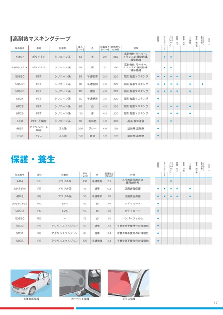 17製品番号基材粘着剤厚み[μm]色粘着強さ[N/cm]耐熱性℃短時間特徴自動車エレクトロニクスゼネラルインダストリー家電・OA製紙・印刷土木建築電車・飛行機ソーラー・風力発電ICカード51407ポリイミドシリコーン系62茶2.5260高耐熱性モーター、トランスの層間絶縁、導体絶縁●●51408JPVKポリイミドシリコーン系65茶3.1260高耐熱性モーター、トランスの層間絶縁、導体絶縁●●50650PETシリコーン系55半透明青3.3220汎用高温マスキング●●●●●50600PETシリコーン系80半透明緑4.0220汎用高温マスキング●●●●●●50680PETシリコーン系80透明4.0220汎用高温マスキング●●●●●61124PETシリコーン系60半透明青3.5220汎用高温マスキング●61128PETシリコーン系85白4.3220汎用高温マスキング●●●●61126PETシリコーン系125赤4.3220汎用高温マスキング●●●●4331PET+不織布シリコーン系110乳白色4.0200高温粉体塗装●●4657アクリルコート綿布ゴム系290グレー4.0180塗装用高耐熱●7140PVCゴム系168黄色4.0170塗装用高耐熱●高耐熱マスキングテープ製品番号基材粘着剤厚み[μm]色粘着強さ[N/cm]耐熱性℃短時間特徴自動車エレクトロニクスゼネラルインダストリー家電・OA製紙・印刷土木建築電車・飛行機ソーラー・風力発電ICカード4185PVCゴム系100青3.3160塗装見切り用●50777PVCアクリル系132青2.0160塗装見切り用●●4174PVCゴム系110鶯色3.4150塗装見切り用●4244PVCゴム系110黄色3.7140塗装見切り用●●4244PV2PVCゴム系137山吹色4.2140塗装見切り用●51108PETゴム系54乳白色3.3150塗装見切り用●7133PPゴム系80青2.0120塗装見切り表面保護●製品番号基材粘着剤厚み[μm]色粘着強さ[N/cm]耐熱性℃短時間特徴自動車エレクトロニクスゼネラルインダストリー家電・OA製紙・印刷土木建築電車・飛行機ソーラー・風力発電ICカード4304クレープ紙ゴム系145茶色4.0163塗装用高耐熱●4302クレープ紙ゴム系170乳白色4.0160塗装用高耐熱●●●●●4328クレープ紙ゴム系175黒青黄赤4.8140高耐熱多色●●●●4330クレープ紙ゴム系175乳白色4.8140塗装用高耐熱●●●●4341クレープ紙ゴム系190茶褐色4.7140塗装用高耐熱●●●●4309PV1クレープ紙ゴム系170茶褐色3.5120塗装用高耐熱●●●●4338クレープ紙ゴム系145緑3.5120鮮やかな緑で視認性良好●4316PV3クレープ紙ゴム系140乳白色3.4100汎用中耐熱●●●●●4317クレープ紙ゴム系140乳白色3.380汎用●●●●4329PV1クレープ紙ゴム系125乳白色3.070汎用●●●●4319クレープ紙ゴム系375茶褐色4.5-曲線マスキング●●●●製品番号基材粘着剤厚み[μm]色粘着強さ[N/cm]特徴自動車エレクトロニクスゼネラルインダストリー家電・OA製紙・印刷土木建築電車・飛行機ソーラー・風力発電ICカード4414PEアクリル系150半透明青2.2汎用表面保護用途屋外使用可●4848PV1PEアクリル系48透明0.8汎用表面保護●●●●●4848PEアクリル系50半透明赤1.9汎用表面保護●●●●●50530PV3POEVA80白1.0ボディガード●50533POEVA96白3.0ボディガード●50560POー75白1.5バンパーフィルム●51132PEアクリルエマルジョン85透明2.8有機溶剤不使用の対環境性●51134PEアクリルエマルジョン84透明2.4有機溶剤不使用の対環境性●51136PEアクリルエマルジョン105半透明緑2.4有機溶剤不使用の対環境性●保護・養生車体表面保護カーペット保護ガラス保護2022.12.28(15:31:04)CMYK再校