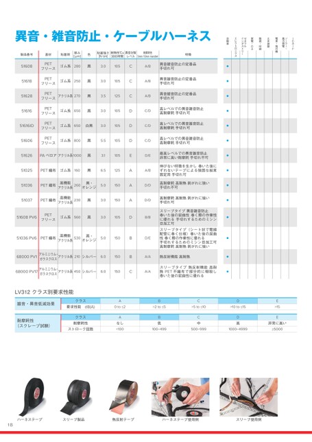 18両面テープ導電性製品番号基材粘着剤厚み[μm]色粘着強さ[N/cm]特徴自動車エレクトロニクスゼネラルインダストリー家電・OA製紙・印刷土木建築電車・飛行機ソーラー・風力発電ICカード60251導電性織布導電性アクリル55グレー0.5/4.6リワーク性●60252導電性織布導電性アクリル55グレー5.5標準タイプ●60253導電性織布導電性アクリル70グレー4.8標準タイプ●60254導電性織布導電性アクリル100グレー6.6標準タイプ●60255導電性織布導電性アクリル150グレー4.5標準タイプ●60256導電性織布導電性アクリル200グレー4.6標準タイプ●60257導電性織布導電性アクリル250グレー4.8標準タイプ●60260導電性不織布導電性アクリル35グレー4.0薄手タイプ●60261導電性不織布導電性アクリル25グレー4.0薄手タイプ●60262導電性不織布導電性アクリル50グレー5.4標準タイプ●60264導電性不織布導電性アクリル17グレー3.5極薄タイプ●60276導電性織布導電性アクリル200黒4.6黒色●60295導電性不織布導電性アクリル50グレー5.0高耐熱260℃SMT用途●60371導電性不織布導電性アクリル30黒3.5EMC対策部品に対するシールディングやグラウンディング●60372導電性不織布導電性アクリル50黒4.3EMC対策部品に対するシールディングやグラウンディング●60374導電性不織布導電性アクリル100黒5.7EMC対策部品に対するシールディングやグラウンディング●60381導電性織布導電性アクリル50グレー8.0EMC対策部品に対するシールディングやグラウンディング●60382導電性不織布導電性アクリル50グレー8.0EMC対策部品に対するシールディングやグラウンディング●60384導電性織布導電性アクリル100グレー8.0EMC対策部品に対するシールディングやグラウンディング●60385導電性不織布導電性アクリル100グレー8.0EMC対策部品に対するシールディングやグラウンディング●雑音・異音低減効果クラスABCDE要求性能dB(A)0to≤2>2to≤5>5to≤10>10to≤15>15耐摩耗性(スクレープ試験)クラスABCDE耐摩耗性なし低中高非常に高いストローク回数<100100–499500–9991000–4999≥5000LV312クラス別要求性能異音・雑音防止・ケーブルハーネス製品番号基材粘着剤厚み[μm]色粘着強さ[N/cm]耐熱性℃x3000時間異音対策レベル耐摩耗性5mm/10mmmandrel特徴自動車エレクトロニクスゼネラルインダストリー家電・OA製紙・印刷土木建築電車・飛行機ソーラー・風力発電ICカード51608PETフリースゴム系280黒3.0105CA/B異音雑音防止の定番品手切れ可●51618PETフリースゴム系250黒3.0105CA/B異音雑音防止の定番品手切れ可●51628PETフリースアクリル系270黒3.5125CA/B異音雑音防止の定番品手切れ可●51616PETフリースゴム系650黒3.0105DC/D高レベルでの異音雑音防止高耐摩耗手切れ可●51616IDPETフリースゴム系650白黒3.0105DC/D高レベルでの異音雑音防止高耐摩耗手切れ可●51606PETフリースゴム系800黒5.5105DC/D高レベルでの異音雑音防止高耐摩耗手切れ可●51626PAベロアアクリル系1000黒3.1105ED/E最高レベルでの異音雑音防止非常に高い耐摩耗手切れ不可●51025PET織布ゴム系160黒6.5125AA/B伸びない特徴を生かし巻いた後にずれないテープによる強固な結束固定用手切れ可●51036PET織布高機能アクリル系260黒・オレンジ5.0150AD/D高耐摩耗高耐熱剥がれに強い手切れ不可●51037PET織布高機能アクリル系230黒3.0150AD/D高耐摩耗高耐熱剥がれに強い手切れ可●51608PV6PETフリースゴム系560黒3.0105DB/Bスリーブタイプ異音雑音防止巻いた後の屈曲性巻く際の作業性に優れる手切れするためのミシン目加工可●51036PV6PET織布高機能アクリル系530黒・オレンジ5.0150BD/Eスリーブタイプ(シート状で電線配管に巻く仕様)巻いた後の屈曲性巻く際の作業性に優れる手切れするためのミシン目加工可高耐摩耗高耐熱剥がれに強い●68000PV1アルミニウム・ガラスクロスアクリル系210シルバー6.0150BA/A熱反射機能高耐熱●68000PV17アルミニウム・ガラスクロスアクリル系450シルバー6.0150CA/Aスリーブタイプ熱反射機能高耐熱PET不織布で部分的に糊殺し巻いた後の屈曲性に優れる●ハーネステープ使用例スリーブ使用例ハーネステープスリーブ製品熱反射テープ製品番号基材粘着剤厚み[μm]色粘着強さ[N/cm]特徴自動車エレクトロニクスゼネラルインダストリー家電・OA製紙・印刷土木建築電車・飛行機ソーラー・風力発電ICカード60213導電性フォーム導電性アクリル200グレー4.0衝撃吸収性復元性●60214導電性フォーム導電性アクリル300グレー4.8衝撃吸収性復元性●60217導電性フォーム導電性アクリル1500グレー5.0衝撃吸収性復元性●60218導電性フォーム導電性アクリル2000グレー5.0衝撃吸収性復元性●60231導電性不織布導電性アクリル25黒(艶消し)3.0耐指紋性艶消し黒●60232導電性織布導電性アクリル35黒(艶消し)3.5耐指紋性艶消し黒●片面テープFPC,PCBのグラウンディング(接地)等のEMC対策部品として2022.12.28(15:31:07)CMYK初校