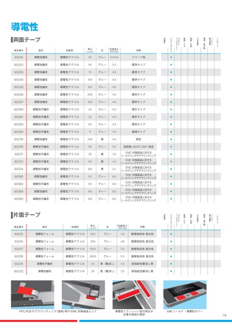 19両面テープ導電性製品番号基材粘着剤厚み[μm]色粘着強さ[N/cm]特徴自動車エレクトロニクスゼネラルインダストリー家電・OA製紙・印刷土木建築電車・飛行機ソーラー・風力発電ICカード60251導電性織布導電性アクリル55グレー0.5/4.6リワーク性●60252導電性織布導電性アクリル55グレー5.5標準タイプ●60253導電性織布導電性アクリル70グレー4.8標準タイプ●60254導電性織布導電性アクリル100グレー6.6標準タイプ●60255導電性織布導電性アクリル150グレー4.5標準タイプ●60256導電性織布導電性アクリル200グレー4.6標準タイプ●60257導電性織布導電性アクリル250グレー4.8標準タイプ●60260導電性不織布導電性アクリル35グレー4.0薄手タイプ●60261導電性不織布導電性アクリル25グレー4.0薄手タイプ●60262導電性不織布導電性アクリル50グレー5.4標準タイプ●60264導電性不織布導電性アクリル17グレー3.5極薄タイプ●60276導電性織布導電性アクリル200黒4.6黒色●60295導電性不織布導電性アクリル50グレー5.0高耐熱260℃SMT用途●60371導電性不織布導電性アクリル30黒3.5EMC対策部品に対するシールディングやグラウンディング●60372導電性不織布導電性アクリル50黒4.3EMC対策部品に対するシールディングやグラウンディング●60374導電性不織布導電性アクリル100黒5.7EMC対策部品に対するシールディングやグラウンディング●60381導電性織布導電性アクリル50グレー8.0EMC対策部品に対するシールディングやグラウンディング●60382導電性不織布導電性アクリル50グレー8.0EMC対策部品に対するシールディングやグラウンディング●60384導電性織布導電性アクリル100グレー8.0EMC対策部品に対するシールディングやグラウンディング●60385導電性不織布導電性アクリル100グレー8.0EMC対策部品に対するシールディングやグラウンディング●雑音・異音低減効果クラスABCDE要求性能dB(A)0to≤2>2to≤5>5to≤10>10to≤15>15耐摩耗性(スクレープ試験)クラスABCDE耐摩耗性なし低中高非常に高いストローク回数<100100–499500–9991000–4999≥5000製品番号基材粘着剤厚み[μm]色粘着強さ[N/cm]耐熱性℃x3000時間異音対策レベル耐摩耗性5mm/10mmmandrel特徴自動車エレクトロニクスゼネラルインダストリー家電・OA製紙・印刷土木建築電車・飛行機ソーラー・風力発電ICカード51608PETフリースゴム系280黒3.0105CA/B異音雑音防止の定番品手切れ可●51618PETフリースゴム系250黒3.0105CA/B異音雑音防止の定番品手切れ可●51628PETフリースアクリル系270黒3.5125CA/B異音雑音防止の定番品手切れ可●51616PETフリースゴム系650黒3.0105DC/D高レベルでの異音雑音防止高耐摩耗手切れ可●51616IDPETフリースゴム系650白黒3.0105DC/D高レベルでの異音雑音防止高耐摩耗手切れ可●51606PETフリースゴム系800黒5.5105DC/D高レベルでの異音雑音防止高耐摩耗手切れ可●51626PAベロアアクリル系1000黒3.1105ED/E最高レベルでの異音雑音防止非常に高い耐摩耗手切れ不可●51025PET織布ゴム系160黒6.5125AA/B伸びない特徴を生かし巻いた後にずれないテープによる強固な結束固定用手切れ可●51036PET織布高機能アクリル系260黒・オレンジ5.0150AD/D高耐摩耗高耐熱剥がれに強い手切れ不可●51037PET織布高機能アクリル系230黒3.0150AD/D高耐摩耗高耐熱剥がれに強い手切れ可●51608PV6PETフリースゴム系560黒3.0105DB/Bスリーブタイプ異音雑音防止巻いた後の屈曲性巻く際の作業性に優れる手切れするためのミシン目加工可●51036PV6PET織布高機能アクリル系530黒・オレンジ5.0150BD/Eスリーブタイプ(シート状で電線配管に巻く仕様)巻いた後の屈曲性巻く際の作業性に優れる手切れするためのミシン目加工可高耐摩耗高耐熱剥がれに強い●68000PV1アルミニウム・ガラスクロスアクリル系210シルバー6.0150BA/A熱反射機能高耐熱●68000PV17アルミニウム・ガラスクロスアクリル系450シルバー6.0150CA/Aスリーブタイプ熱反射機能高耐熱PET不織布で部分的に糊殺し巻いた後の屈曲性に優れる●製品番号基材粘着剤厚み[μm]色粘着強さ[N/cm]特徴自動車エレクトロニクスゼネラルインダストリー家電・OA製紙・印刷土木建築電車・飛行機ソーラー・風力発電ICカード60213導電性フォーム導電性アクリル200グレー4.0衝撃吸収性復元性●60214導電性フォーム導電性アクリル300グレー4.8衝撃吸収性復元性●60217導電性フォーム導電性アクリル1500グレー5.0衝撃吸収性復元性●60218導電性フォーム導電性アクリル2000グレー5.0衝撃吸収性復元性●60231導電性不織布導電性アクリル25黒(艶消し)3.0耐指紋性艶消し黒●60232導電性織布導電性アクリル35黒(艶消し)3.5耐指紋性艶消し黒●片面テープFPC,PCBのグラウンディング(接地)等のEMC対策部品として導電性とクッション性の両立が必要な部品の固定EMIシールド・導電性カバー2022.12.28(15:31:12)CMYK初校