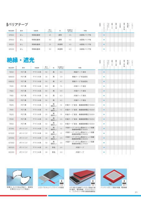 21製品番号基材粘着剤厚み[μm]色粘着強さ[N/cm]特徴自動車エレクトロニクスゼネラルインダストリー家電・OA製紙・印刷土木建築電車・飛行機ソーラー・風力発電ICカード69206なしピュアアクリル系150透明6.9UVカット●69208なしピュアアクリル系200透明7.2UVカット●69401なしピュアアクリル系25透明5.2ハード●69402なしピュアアクリル系50透明5.6ハード●●69404なしピュアアクリル系100透明6.2ハード●69405なしピュアアクリル系125透明6.9ハード●69604なしピュアアクリル系100透明13.6UV硬化型●69605なしピュアアクリル系125透明14.8UV硬化型●69606なしピュアアクリル系150透明tbdUV硬化型●69607なしピュアアクリル系175透明16.9UV硬化型●●69608なしピュアアクリル系200透明18.0UV硬化型●69802なしピュアアクリル系50透明9.1UV硬化型●69804なしピュアアクリル系100透明12.7UV硬化型●69806なしピュアアクリル系150透明14.1UV硬化型●69808なしピュアアクリル系200透明16.9UV硬化型●製品番号基材粘着剤厚み[μm]色粘着強さ[N/cm]特徴自動車エレクトロニクスゼネラルインダストリー家電・OA製紙・印刷土木建築電車・飛行機ソーラー・風力発電ICカード61562なし特殊粘着剤25透明4.5水蒸気バリア性●61563なし特殊粘着剤50透明5.0水蒸気バリア性●61531なし特殊粘着剤25非透明4.5水蒸気バリア性●61533なし特殊粘着剤50非透明6.5水蒸気バリア性●バリアテープ製品番号基材粘着剤厚み[μm]色粘着強さ[N/cm]特徴自動車エレクトロニクスゼネラルインダストリー家電・OA製紙・印刷土木建築電車・飛行機ソーラー・風力発電ICカード60234導電性織布導電性アクリル55黒(艶消し)4.5耐指紋性艶消し黒●60238導電性織布導電性アクリル45黒(艶消し)5.5耐指紋性艶消し黒●60246導電性フォーム導電性アクリル300グレー4.1ガスケットテープ●60248導電性フォーム導電性アクリル500グレー4.8ガスケットテープ●60249導電性フォーム導電性アクリル700グレー4.8ガスケットテープ●60317導電性銅箔導電性アクリル30オレンジ4.6低圧での圧着が可能●60318導電性銅箔導電性アクリル50オレンジ5.6低圧での圧着が可能●60685導電性フォーム導電性アクリル500グレー6.0EMI対策部品に対するシールディングやグラウンディング●60687導電性フォーム導電性アクリル700グレー8.0EMI対策部品に対するシールディングやグラウンディング●60688導電性フォーム導電性アクリル1000グレー6.0EMI対策部品に対するシールディングやグラウンディング●製品番号基材粘着剤厚み[μm]色粘着強さ[N/cm]特徴自動車エレクトロニクスゼネラルインダストリー家電・OA製紙・印刷土木建築電車・飛行機ソーラー・風力発電ICカード7650PET黒アクリル系50黒5.0両面テープ遮光●68830PET黒アクリル系30黒3.9両面テープ完全遮光●68832PET黒アクリル系50黒4.7両面テープ完全遮光●7100PET黒アクリル系100黒7.5片面テープ遮光●7160PET黒アクリル系60黒5.9片面テープ遮光●7180PET黒アクリル系80黒6.3片面テープ遮光●7250PET黒アクリル系50黒4.2片面テープ遮光●7905PET黒アクリル系5黒(艶消し)1.0片面テープ遮光絶縁破壊電圧1500V●7910PET黒アクリル系10黒(艶消し)1.2片面テープ遮光絶縁破壊電圧1500V●7920PET黒アクリル系20黒(艶消し)1.9片面テープ遮光絶縁破壊電圧1500V●7930PET黒アクリル系30黒(艶消し)2.6片面テープ遮光絶縁破壊電圧1500V●7950PET黒アクリル系50黒(艶消し)4.0片面テープ遮光絶縁破壊電圧1500V●67310ポリイミドアクリル系10黒(艶消し)1.2片面テープリチウム電池のエッジ保護絶縁破壊電圧1500V●67320ポリイミドアクリル系20黒(艶消し)1.7片面テープリチウム電池のエッジ保護絶縁破壊電圧2400V●67330ポリイミドアクリル系30黒(艶消し)2.5片面テープリチウム電池のエッジ保護絶縁破壊電圧3600V●67350ポリイミドアクリル系50黒(艶消し)3.5片面テープリチウム電池のエッジ保護絶縁破壊電圧3700V●66320ポリイミドアクリル系20茶色2.0片面テープ●66330ポリイミドアクリル系30茶色3.0片面テープ●絶縁・遮光2022.12.28(15:31:16)CMYK再校有機ELなどの封止用途に。柔軟性を要求されるバリア用途にLCDパネルとバックライトの固定LED周りの各種ディスプレイ部品の遮光・固定。電気絶縁。グラファイトシート、フェライトシート等の表面保護固定バッテリーのエッジ部品の保護。電気絶縁