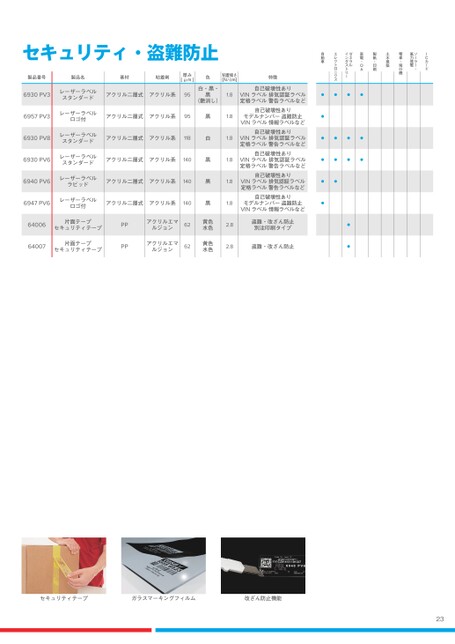 23製品番号製品名基材粘着剤厚み[μm]色粘着強さ[N/cm]特徴自動車エレクトロニクスゼネラルインダストリー家電・OA製紙・印刷土木建築電車・飛行機ソーラー・風力発電ICカード4247PV2片面テープPVCゴム系54透明2.4梱包用表面保護手切れ性●4251片面テープPVCゴム系200透明黒白青黄赤緑灰1.6汎用絶縁テープ※お求めのサイズによってお取扱いのない色がございます。詳しくはお問い合わせください。●4169PV8ラインテープPVC天然ゴム203白黄赤青緑トラ1.6倉庫、工場、店舗等の区画ライン表示●60960ラインテープPETフィルム合成ゴム175白黄赤青緑オレンジ黒トラ4.5耐摩耗性に優れた高耐久ラインテープ。倉庫、工場、店舗等の区画ライン表示●60943すべり止めテープPVCアクリル系680黒トラ黄蓄光7.3工場、工事現場の機械や車両等の足場の滑り防止屋内・屋外使用可●●60954すべり止めテープPVC+鉱物粒子アクリル系1185黒黄トラグレー7.0工場、工事現場の機械や車両等の足場の滑り防止高耐久性屋内・屋外使用可●60955すべり止めテープアルミ+鉱物粒子アクリル系700黒黄トラ8.0アルミ入り基材でトレッドプレートなど凹凸面へ良くフィットし、優れた耐久性屋内・屋外使用可●4563片面テープストップテープシリコーン/布天然ゴム380グレー3.6空転防止付着防止対策フラットタイプ●●4863片面テープストップテープシリコーン/布天然ゴム620グレー3.0空転防止付着防止対策エンボスタイプ●●4600自己融着テープエクストリームシリコーンゴムなし500黒・半透明-水漏れ・油漏れ対策水分・油・汚れの上から使用可破壊電圧8KV●●4600HD自己融着テープエクストリームシリコーンゴムなし750黒-水漏れ・油漏れ対策水分・油・汚れの上から使用可破壊電圧12KV●●4610ダクトテープPE+布ゴム系150グレー4.5作業性良好空調ダクト●4665片面テープ布基材PE+メッシュゴム系215半透明9.0屋外補修手切れ性●●7475PV2片面テープPETアクリル系-白-シリコーンはく離剤試験用●51206片面テープ高密度PEピュアアクリル114半透明4.3食品、電気製品等の製造・梱包工程の搬送経路のすべり助長●●●●50565片面テープアルミ基材アルミホイルアクリル系90シルバー6.0ダクト補修耐熱●●●60650アルミテープアルミホイルアクリル系90シルバー9.0アルミ基材厚50µmセパ無●60652アルミテープアルミホイルアクリル系90シルバー9.0アルミ基材厚50µmセパ付●セキュリティ・盗難防止製品番号製品名基材粘着剤厚み[μm]色粘着強さ[N/cm]特徴自動車エレクトロニクスゼネラルインダストリー家電・OA製紙・印刷土木建築電車・飛行機ソーラー・風力発電ICカード6930PV3レーザーラベルスタンダードアクリル二層式アクリル系95白・黒・黒(艶消し)1.8自己破壊性ありVINラベル排気認証ラベル定格ラベル警告ラベルなど●●●●6957PV3レーザーラベルロゴ付アクリル二層式アクリル系95黒1.8自己破壊性ありモデルナンバー盗難防止VINラベル情報ラベルなど●6930PV8レーザーラベルスタンダードアクリル二層式アクリル系118白1.8自己破壊性ありVINラベル排気認証ラベル定格ラベル警告ラベルなど●●●●6930PV6レーザーラベルスタンダードアクリル二層式アクリル系140黒1.8自己破壊性ありVINラベル排気認証ラベル定格ラベル警告ラベルなど●●●●6940PV6レーザーラベルラビッドアクリル二層式アクリル系140黒1.8自己破壊性ありVINラベル排気認証ラベル定格ラベル警告ラベルなど●●6947PV6レーザーラベルロゴ付アクリル二層式アクリル系140黒1.8自己破壊性ありモデルナンバー盗難防止VINラベル情報ラベルなど●64006片面テープセキュリティテープPPアクリルエマルジョン62黄色水色2.8盗難・改ざん防止別注印刷タイプ●64007片面テープセキュリティテープPPアクリルエマルジョン62黄色水色2.8盗難・改ざん防止●セキュリティテープガラスマーキングフィルム改ざん防止機能2022.12.28(15:31:20)CMYK念校