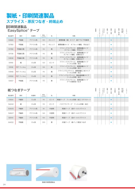 24製品番号基材粘着剤厚み[μm]色特徴自動車エレクトロニクスゼネラルインダストリー家電・OA製紙・印刷土木建築電車・飛行機ソーラー・風力発電ICカード4441クレープ紙水溶性アクリル140水色・白色標準水溶性片面テープ終端止めなど●4445平面紙水溶性アクリル190水色標準水溶性片面テープ終端止めなど●4446平面紙水溶性アクリル165白標準水溶性片面テープ終端止めなど●51444平面紙水溶性アクリル50青カルシウム耐性水溶性片面テープ製品スプライス用途など●51445平面紙水溶性アクリル80青カルシウム耐性水溶性片面テープ製品スプライス用途など●51446平面紙水溶性アクリル105青標準水溶性片面テープ終端止めなど●61445平面紙(黒)水溶性アクリル80基材黒粘着剤青カルシウム耐性水溶性片面テープ製品スプライス用途など●51912特殊紙水溶性アクリル90青カルシウム耐性水溶性両面テープ●51913特殊紙水溶性アクリル65青カルシウム耐性水溶性両面テープ●51914特殊紙水溶性アクリル90青・半透明標準水溶性両面テープ(良タック)●51915なし水溶性アクリル50青標準水溶性両面テープ●51916なし水溶性アクリル50青標準水溶性両面テープ●61914特殊紙水溶性アクリル70青標準水溶性両面テープ(セパレータ:非水溶性)●水溶性両面/片面テープ製品番号基材粘着剤厚み[μm]色特徴自動車エレクトロニクスゼネラルインダストリー家電・OA製紙・印刷土木建築電車・飛行機ソーラー・風力発電ICカード51150平面紙水溶性アクリル100青フライングスプライス層間剝離2本タイプ●51152平面紙水溶性アクリル100青フライングスプライス層間剝離1本タイプ●51157平面紙水溶性アクリル100青フライングスプライス層間剝離2本タイプ高耐熱●61152平面紙水溶性アクリル100青フライングスプライス層間剝離2本タイプ●製紙関連製品水溶性EasySplice®テープ製品番号基材粘着剤厚み[μm]色特徴自動車エレクトロニクスゼネラルインダストリー家電・OA製紙・印刷土木建築電車・飛行機ソーラー・風力発電ICカード51904不織布ゴム系110ピンク両面テープフィルム印刷・加工コアスタート●54242紙ゴム系110ピンクバタフライテープフィルム印刷・加工●50605不織布アクリル系90半透明両面テープ段ボールスプライス●50607不織布アクリル系120半透明両面テープ段ボールスプライス●68144不織布アクリル系100半透明両面テープ段ボールスプライス●64432平面紙ゴム系300青片面テープ紙パック原反つなぎ●紙つなぎテープ製紙・印刷関連製品スプライス・原反つなぎ・終端止め製品番号基材粘着剤厚み[μm]色特徴自動車エレクトロニクスゼネラルインダストリー家電・OA製紙・印刷土木建築電車・飛行機ソーラー・風力発電ICカード51680平面紙アクリル系100オレンジ層間剝離(弱)タイプ紙グラビア印刷用●51780平面紙アクリル系100オレンジ層間剝離タイプオフセット輪転手仕立て●51788平面紙(黒)アクリル系110黒フライングスプライス層間剝離タイプオフセット輪転手仕立て●51738平面紙(黒)アクリル系110黒フライングスプライス層間剝離タイプオフセット輪転自動仕立て●51838平面紙(黒)アクリル系110黒フライングスプライス層間剝離タイプオフセット輪転自動仕立て●51910紙ゴム系120ピンクフライングスプライス層間剝離タイプフィルム印刷・加工●51918PETフィルムゴム系105黒フライングスプライス層間剝離タイプフィルム印刷・加工●51948PETフィルムゴム系115黒フライングスプライス層間剥離2本タイプフィルム印刷・加工●61958PETフィルムゴム系105黒フライングスプライス微粘着剝離タイプフィルム印刷・加工●51457平面紙アクリル系110青フライングスプライス層間剝離タイプラベル紙原反つなぎ●印刷関連製品EasySplice®テープ製紙印刷関連製品2022.12.28(15:31:22)CMYK初校