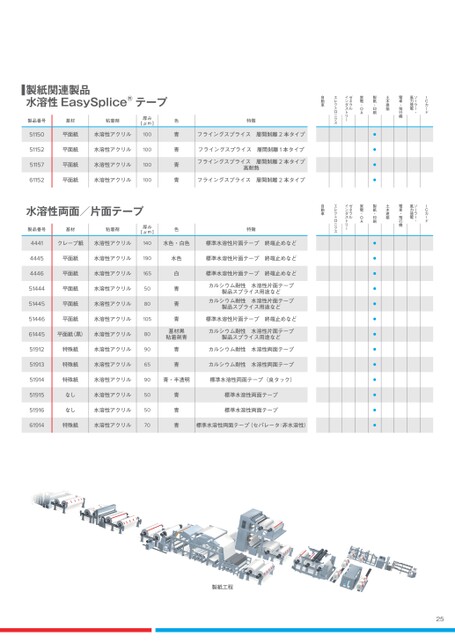 25製品番号基材粘着剤厚み[μm]色特徴自動車エレクトロニクスゼネラルインダストリー家電・OA製紙・印刷土木建築電車・飛行機ソーラー・風力発電ICカード4441クレープ紙水溶性アクリル140水色・白色標準水溶性片面テープ終端止めなど●4445平面紙水溶性アクリル190水色標準水溶性片面テープ終端止めなど●4446平面紙水溶性アクリル165白標準水溶性片面テープ終端止めなど●51444平面紙水溶性アクリル50青カルシウム耐性水溶性片面テープ製品スプライス用途など●51445平面紙水溶性アクリル80青カルシウム耐性水溶性片面テープ製品スプライス用途など●51446平面紙水溶性アクリル105青標準水溶性片面テープ終端止めなど●61445平面紙(黒)水溶性アクリル80基材黒粘着剤青カルシウム耐性水溶性片面テープ製品スプライス用途など●51912特殊紙水溶性アクリル90青カルシウム耐性水溶性両面テープ●51913特殊紙水溶性アクリル65青カルシウム耐性水溶性両面テープ●51914特殊紙水溶性アクリル90青・半透明標準水溶性両面テープ(良タック)●51915なし水溶性アクリル50青標準水溶性両面テープ●51916なし水溶性アクリル50青標準水溶性両面テープ●61914特殊紙水溶性アクリル70青標準水溶性両面テープ(セパレータ:非水溶性)●水溶性両面/片面テープ製品番号基材粘着剤厚み[μm]色特徴自動車エレクトロニクスゼネラルインダストリー家電・OA製紙・印刷土木建築電車・飛行機ソーラー・風力発電ICカード51150平面紙水溶性アクリル100青フライングスプライス層間剝離2本タイプ●51152平面紙水溶性アクリル100青フライングスプライス層間剝離1本タイプ●51157平面紙水溶性アクリル100青フライングスプライス層間剝離2本タイプ高耐熱●61152平面紙水溶性アクリル100青フライングスプライス層間剝離2本タイプ●製紙関連製品水溶性EasySplice®テープ製品番号基材粘着剤厚み[μm]色特徴自動車エレクトロニクスゼネラルインダストリー家電・OA製紙・印刷土木建築電車・飛行機ソーラー・風力発電ICカード51904不織布ゴム系110ピンク両面テープフィルム印刷・加工コアスタート●54242紙ゴム系110ピンクバタフライテープフィルム印刷・加工●50605不織布アクリル系90半透明両面テープ段ボールスプライス●50607不織布アクリル系120半透明両面テープ段ボールスプライス●68144不織布アクリル系100半透明両面テープ段ボールスプライス●64432平面紙ゴム系300青片面テープ紙パック原反つなぎ●製品番号基材粘着剤厚み[μm]色特徴自動車エレクトロニクスゼネラルインダストリー家電・OA製紙・印刷土木建築電車・飛行機ソーラー・風力発電ICカード51680平面紙アクリル系100オレンジ層間剝離(弱)タイプ紙グラビア印刷用●51780平面紙アクリル系100オレンジ層間剝離タイプオフセット輪転手仕立て●51788平面紙(黒)アクリル系110黒フライングスプライス層間剝離タイプオフセット輪転手仕立て●51738平面紙(黒)アクリル系110黒フライングスプライス層間剝離タイプオフセット輪転自動仕立て●51838平面紙(黒)アクリル系110黒フライングスプライス層間剝離タイプオフセット輪転自動仕立て●51910紙ゴム系120ピンクフライングスプライス層間剝離タイプフィルム印刷・加工●51918PETフィルムゴム系105黒フライングスプライス層間剝離タイプフィルム印刷・加工●51948PETフィルムゴム系115黒フライングスプライス層間剥離2本タイプフィルム印刷・加工●61958PETフィルムゴム系105黒フライングスプライス微粘着剝離タイプフィルム印刷・加工●51457平面紙アクリル系110青フライングスプライス層間剝離タイプラベル紙原反つなぎ●製紙工程2022.12.28(15:31:23)CMYK初校