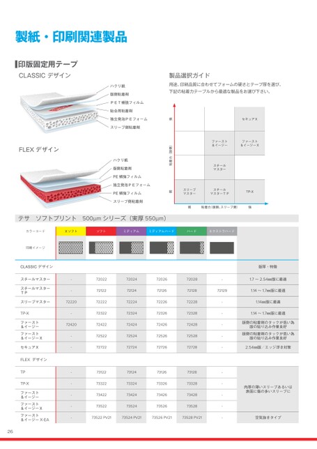 26カラーコードXソフトソフトミディアムミディアムハードハードエクストラハード印刷イメージCLASSICデザイン版厚・特徴スチールマスター-72022720247202672028-1.7~2.54㎜版に最適スチールマスターTP-72122721247212672128721291.14~1.7㎜版に最適スリーブマスター7222072222722247222672228-1.14㎜版に最適TP-X-72322723247232672328-1.14~1.7㎜版に最適ファースト&イージー7242072422724247242672428-版側の粘着剤のタックが低い為版の貼り込み作業良好ファースト&イージーX-72522725247252672528-版側の粘着剤のタックが低い為版の貼り込み作業良好セキュアX-72722727247272672728-2.54㎜版/エッジ浮き対策FLEXデザインTP-73122731247312673128-肉厚の薄いスリーブあるいは表面に傷の多いスリーブにTP-X-73322733247332673328-ファースト&イージー-73422734247342673428-ファースト&イージーX-73522735247352673528-ファースト&イージーX-EA-73522PV2173524PV2173526PV2173528PV21-空気抜きタイプカラーコードXソフトソフトミディアムミディアムハードハード印刷イメージCLASSICデザイン版厚・特徴スチールマスター52018520175201652015520141.7~2.54㎜版に最適スチールマスターTP52118521175211652115521141.14~1.7㎜版に最適セキュア52818528175281652815528142.54㎜版/エッジ浮き対策FLEXデザインファースト&イージー5341853417534165341553414版側の粘着剤のタックが低い為版の貼り込み作業良好製紙・印刷関連製品印版固定用テープテサソフトプリント500μmシリーズ(実厚550μm)テサソフトプリント380μmシリーズ(実厚430μm)製品番号基材粘着剤厚み[μm]色粘着強さ[N/cm]特徴自動車エレクトロニクスゼネラルインダストリー家電・OA製紙・印刷土木建築電車・飛行機ソーラー・風力発電ICカード52307PVCアクリル系70透明-印版固定テープノンクッションタイプ●52310PVCゴム系100透明-印版固定テープノンクッションタイプ●52315PVCゴム系150黄色-印版固定テープノンクッションタイプ●52320PVCゴム系200白-印版固定テープノンクッションタイプ●52325PVCゴム系250ピンク-印版固定テープノンクッションタイプ●52330布ゴム系380黄色-印版固定テープノンクッションタイプ●52332PVCアクリル系300透明-印版固定テープノンクッションタイプ●51235PP/PEゴム系111赤5.5製袋・段ボール用開封テープ●53035PPゴム系135赤7.0製袋・段ボール用開封テープ非シリコーン系剥離剤●53488PPゴム系86赤白6.0製袋・段ボール用開封テープ非シリコーン系剥離剤●52918PETフィルムアクリル系120透明-印版固定テープノンクッションタイプ●その他製品製品選択ガイド用途、印刷品質に合わせてフォームの硬さとテープ厚を選び、下記の粘着力テーブルから最適な製品をお選び下さい。弱粘着力(版胴、スリーブ側)強弱粘着力(版側)強セキュアXファースト&イージーファースト&イージーXスチールマスタースリーブマスタースチールマスターTPTP-Xハクリ紙PET補強フィルム独立発泡PEフォーム版側粘着剤貼合用粘着剤スリーブ側粘着剤CLASSICデザインハクリ紙PE補強フィルムPE補強フィルム版側粘着剤独立発泡PEフォームスリーブ側粘着剤FLEXデザインカラーコードXソフトソフトミディアムミディアムハードハード印刷イメージCLASSICデザイン版厚・特徴ビッグフォーム--52060--空気抜きタイプ版の貼り込み作業良好52062はロータックタイプビッグフォームLT--52062--テサソフトプリント1500µmシリーズ(実厚1650µm)2022.12.28(15:32:01)CMYK初校