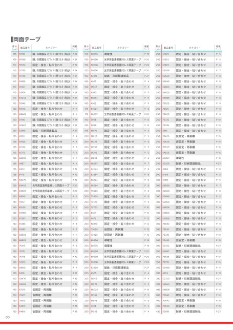 30両面テープ厚み〔μm〕製品番号カテゴリー掲載ページ10551918製紙・印刷関連製品スプライス・原反つなぎ・終端止めP2410561958製紙・印刷関連製品スプライス・原反つなぎ・終端止めP2411051570固定・接合・貼り合わせP1311051788製紙・印刷関連製品スプライス・原反つなぎ・終端止めP2411051738製紙・印刷関連製品スプライス・原反つなぎ・終端止めP2411051838製紙・印刷関連製品スプライス・原反つなぎ・終端止めP2411051457製紙・印刷関連製品スプライス・原反つなぎ・終端止めP2411051904製紙・印刷関連製品スプライス・原反つなぎ・終端止めP2411054242製紙・印刷関連製品スプライス・原反つなぎ・終端止めP2411551948製紙・印刷関連製品スプライス・原反つなぎ・終端止めP2412051576固定・接合・貼り合わせP1112088642固定・接合・貼り合わせP1112051910製紙・印刷関連製品スプライス・原反つなぎ・終端止めP2412050607製紙・印刷関連製品スプライス・原反つなぎ・終端止めP2412052918製紙・印刷関連製品P271254928固定・接合・貼り合わせP412551928固定・接合・貼り合わせP412561370固定・接合・貼り合わせP512561375固定・接合・貼り合わせP512568595固定・接合・貼り合わせP71254987固定・接合・貼り合わせP111258402固定・接合・貼り合わせP121258475固定・接合・貼り合わせP1212558475固定・接合・貼り合わせP1212569405光学用高透明基材レス両面テープP2012569605光学用高透明基材レス両面テープP2013068616固定・接合・貼り合わせP111404942固定・接合・貼り合わせP414061529固定・接合・貼り合わせP514060980固定・接合・貼り合わせP1115061380固定・接合・貼り合わせP515061385固定・接合・貼り合わせP515061885固定・接合・貼り合わせP615068596固定・接合・貼り合わせP715066822固定・接合・貼り合わせP815075415固定・接合・貼り合わせP915076115固定・接合・貼り合わせP915075715固定・接合・貼り合わせP1015052215固定・接合・貼り合わせP1115068618固定・接合・貼り合わせP111508476固定・接合・貼り合わせP1215058476固定・接合・貼り合わせP1215058486固定・接合・貼り合わせP1215067215仮固定・再剥離P1515070415仮固定・再剥離P1515070615仮固定・再剥離P1515064815仮固定・再剥離P1515064816仮固定・再剥離P15厚み〔μm〕製品番号カテゴリー掲載ページ15060255導電性P1915069206光学用高透明基材レス両面テープP2015069606光学用高透明基材レス両面テープP2015069806光学用高透明基材レス両面テープP2015052315製紙・印刷関連製品P271604967固定・接合・貼り合わせP416051967固定・接合・貼り合わせP41604940固定・接合・貼り合わせP1116088644固定・接合・貼り合わせP111604962固定・接合・貼り合わせP1117564624固定・接合・貼り合わせP617569607光学用高透明基材レス両面テープP201905938固定・接合・貼り合わせP131905939固定・接合・貼り合わせP1319551975固定・接合・貼り合わせP420061220固定・接合・貼り合わせP520061335固定・接合・貼り合わせP520061390固定・接合・貼り合わせP520061395固定・接合・貼り合わせP520061895固定・接合・貼り合わせP620068597固定・接合・貼り合わせP720062624固定・接合・貼り合わせP820062864固定・接合・貼り合わせP820066824固定・接合・貼り合わせP820066984固定・接合・貼り合わせP820075620固定・接合・貼り合わせP920075920固定・接合・貼り合わせP920076120固定・接合・貼り合わせP920075720固定・接合・貼り合わせP102008401固定・接合・貼り合わせP122008478固定・接合・貼り合わせP1220058478固定・接合・貼り合わせP1220070620仮固定・再剥離P1520070420仮固定・再剥離P1520060256導電性P1920060276導電性P1920069208光学用高透明基材レス両面テープP2020069608光学用高透明基材レス両面テープP2020069808光学用高透明基材レス両面テープP2020052320製紙・印刷関連製品P272054965固定・接合・貼り合わせP420551965固定・接合・貼り合わせP422051970固定・接合・貼り合わせP422066022固定・接合・貼り合わせP1323061345固定・接合・貼り合わせP523061845固定・接合・貼り合わせP62504926固定・接合・貼り合わせP425051926固定・接合・貼り合わせP4厚み〔μm〕製品番号カテゴリー掲載ページ25061225固定・接合・貼り合わせP525061325固定・接合・貼り合わせP525061825固定・接合・貼り合わせP625068598固定・接合・貼り合わせP725062625固定・接合・貼り合わせP825062645固定・接合・貼り合わせP825062865固定・接合・貼り合わせP825066825固定・接合・貼り合わせP825066985固定・接合・貼り合わせP825075925固定・接合・貼り合わせP925076125固定・接合・貼り合わせP925075625固定・接合・貼り合わせP925075725固定・接合・貼り合わせP1025075745固定・接合・貼り合わせP102504914固定・接合・貼り合わせP1125070425仮固定・再剥離P1525070625仮固定・再剥離P1525070525仮固定・再剥離P1525064825仮固定・再剥離P1525060257導電性P1925052325製紙・印刷関連製品P272954968固定・接合・貼り合わせP1330061315固定・接合・貼り合わせP530061815固定・接合・貼り合わせP530068599固定・接合・貼り合わせP730062626固定・接合・貼り合わせP830062646固定・接合・貼り合わせP830062866固定・接合・貼り合わせP830066826固定・接合・貼り合わせP830066866固定・接合・貼り合わせP830066986固定・接合