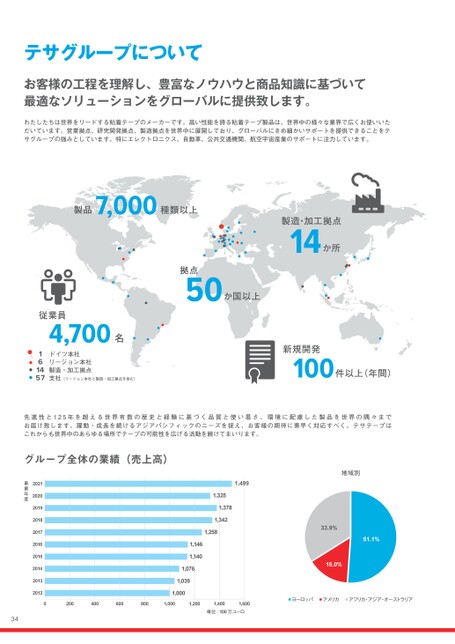 3402004006008001,0001,2001,4001,600A20122013201420152016201720182019202020211,4991,3251,3781,3421,2581,1461,1401,0391,0761,000単位:100万ユーロ事業年度お客様の工程を理解し、豊富なノウハウと商品知識に基づいて最適なソリューションをグローバルに提供致します。グループ全体の業績(売上高)テサグループについてわたしたちは世界をリードする粘着テープのメーカーです。高い性能を誇る粘着テープ製品は、世界中の様々な業界で広くお使いいただいています。営業拠点、研究開発拠点、製造拠点を世界中に展開しており、グローバルにきめ細かいサポートを提供できることをテサグループの強みとしています。特にエレクトロニクス、自動車、公共交通機関、航空宇宙産業のサポートに注力しています。先進性と125年を超える世界有数の歴史と経験に基づく品質と使い易さ、環境に配慮した製品を世界の隅々までお届け致します。躍動・成長を続けるアジアパシフィックのニーズを捉え、お客様の期待に素早く対応すべく、テサテープはこれからも世界中のあらゆる場所でテープの可能性を広げる活動を続けてまいります。1ドイツ本社6リージョン本社14製造・加工拠点57支社(リージョン本社と製造・加工拠点を含む)地域別1882年3月28日ハンブルグの薬剤師が、新しい医療用テープの特許を取得しました。薬剤師の名は、ポール・カール・バイヤスドルフ(1836‐1896)。それまでのように患部を悪化させることなく、傷が癒える初めての絆創膏でした。この発明が今日のバイヤスドルフ社を築く礎となり、1882年のこの日は、バイヤスドルフ社の創立日とされています。テサの歩みがテープの歴史テサドイツ本社沿革1882ポール・カール・バイヤスドルフが絆創膏の特許取得1897自転車タイヤ修理用の粘着テープ『シトプラスト』発売1901粘着剤が白色化した絆創膏『ロイコプラスト』を発明1908ブランド名『tesa(テサ)』が誕生1911ニベア製品生産開始1936粘着テープのブランドとして『tesa(テサ)』が登場1948卓上ディスペンサー登場1977デンマークのテープメーカーNopiを吸収合併1989北米大手粘着メーカーttiを吸収合併1993バイヤスドルフ本社オフィス開設テサヨーロッパ生産センターISO9002認証取得1997マレーシア工場ISO9002認証取得1998シンガポール工場QS9000認証取得1999テサアジアパシフィックをシンガポールに設立2001バイヤスドルフの100%出資により新会社tesaAGとして独立2005中国蘇州に新工場を設立2009欧州会社法に基づきテサドイツ本社をtesaSEに改称2016tesaSEの本社ハンブルグ郊外に新社屋を建設し、移転2018FunctionalCoatings,Twin-lock,Sugru,niewiederbohren社を吸収合併わたしたちは社会に対してよい影響を与えるため、資源を守ることと社会的責務を果たすことを目標としています。2016年には国連グローバルコンパクト(UNGC)に加盟し、持続可能な成長を実現するための取り組みを継続して実施しています。特に環境保護、社会貢献、社員への責任、持続可能な製品の開発と安全性に重点を置いて取り組んでいます。CSR活動か所14製品種類以上7,000か国以上拠点50100新規開発4,700従業員名製造・加工拠点件以上(年間)会社名テサテープ株式会社本社所在地〒108-0072 東京都港区白金1-27-6 白金高輪ステーションビル8FTEL:03-6833-2300㈹ FAX:03-3473-7440㈹創立1964年(昭和39年)11月18日資本金3億円代表者トーマスガスナー主要取引銀行三井住友銀行 渋谷支店日本法人東京本社〒108-0072東京都港区白金1-27-6 白金高輪ステーションビル8F名古屋営業所〒460-0002愛知県名古屋市中区丸の内1-4-12 arexビル7F大阪営業所〒532-0011大阪府大阪市淀川区西中島5-14-5 ニッセイ新大阪南口ビル9Fテクニカルセンター〒108-0072東京都港区白金1-27-6 白金高輪ステーションビル10F小牧物流センター〒485-0075愛知県小牧市三ツ渕南播州1221所在地■ヨーロッパ■アメリカ■アフリカ・アジア・オーストラリア51.1%15.0%33.9%2022.12.28(15:34:26)CMYK念校