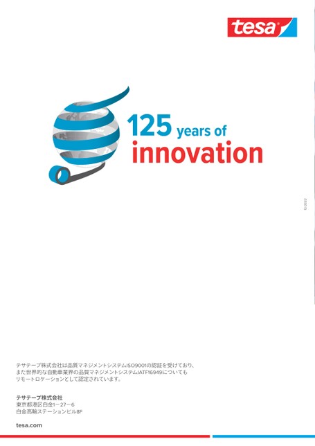 テサテープ株式会社東京都港区白金1-27-6白金高輪ステーションビル8F12/2022テサテープ株式会社は品質マネジメントシステムISO9001の認証を受けており、また世界的な自動車業界の品質マネジメントシステムIATF16949についてもリモートロケーションとして認定されています。テサテープ製品総合カタログtesa.com2022.12.28(16:45:44)CMYK念校4